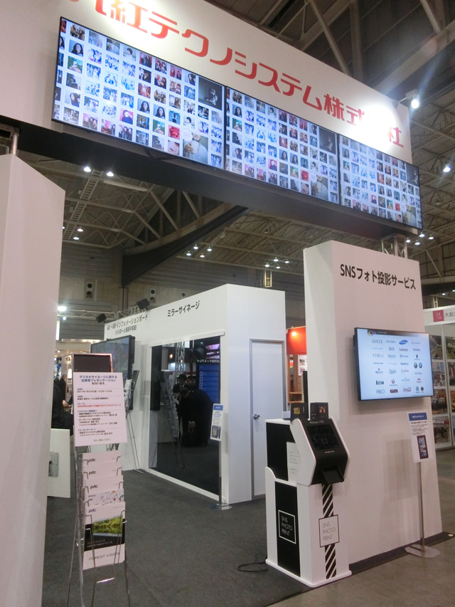 インスタグラムなどのSNSを利用して、指定のハッシュタグで投稿された画像をリアルタイムにデジタルサイネージへ投影できるシステムを参考出品しました。イベントや商業施設、スタジアムなどで投稿された画像がサイネージに表示されることでイベントが盛り上がり、その様子をSNSで拡散することができます。今回は来場者の方に展示会専用のハッシュタグに投稿いただき、ノベルティとして、投稿した写真を専用のカードにプリントしてお渡ししました。
